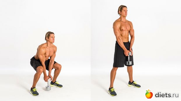 Техника: встаньте прямо, удерживая перед собой гантель обеими руками. Сохраняя спину прямой, а мышцы кора в напряжении, присядьте до тех пор, пока гантель почти не коснется пола. Встаньте, чтобы вернуться в исходное положение.