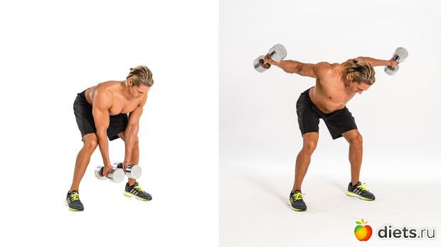 Техника: возьмите легкие гантели в каждую руку и наклонитесь вперед, не округляя спину. Сохраняя небольшой изгиб в локтях, поднимите гантели на высоту плеч, затем опустите обратно в исходное положение.