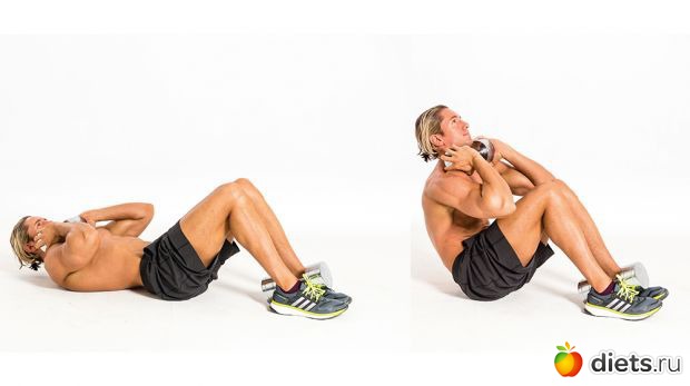 Техника: лягте на пол, удерживания гантель на груди. Напрягите мышцы живота, поднимите туловище, а затем медленно опуститесь обратно.