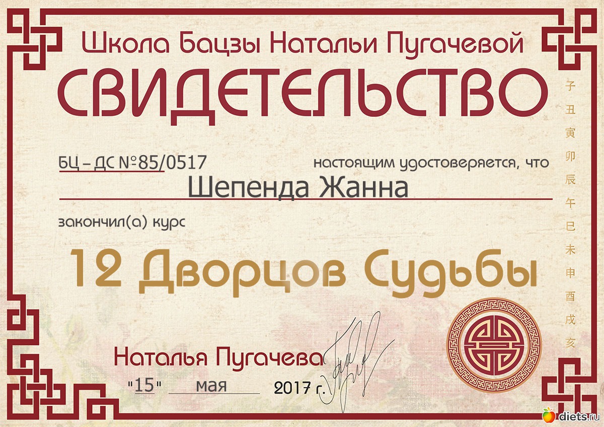 Сертификат о прохождении курса 12 дворцов у преподавателя Натальи Пугачевой., альбом: Астрология