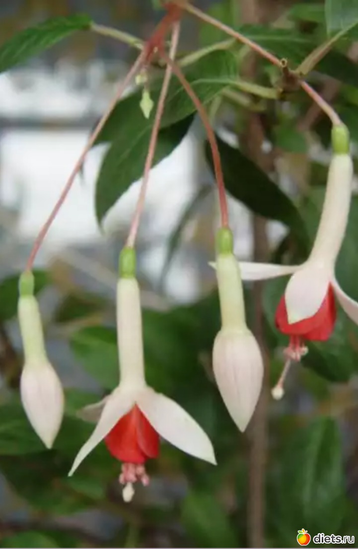 «ФУКСИЯ-Нимфа.WATER NYMPH.Water Nymph .Старая добрая Нимфа. Чашелистики белые, или, точнее, цвета слоновой кости. Лепестки красные. Все лето усыпана гроздьями нежных и ярких, изящных немахровых цветов. Сорт кустовой.Хорошо формировать штамб.»