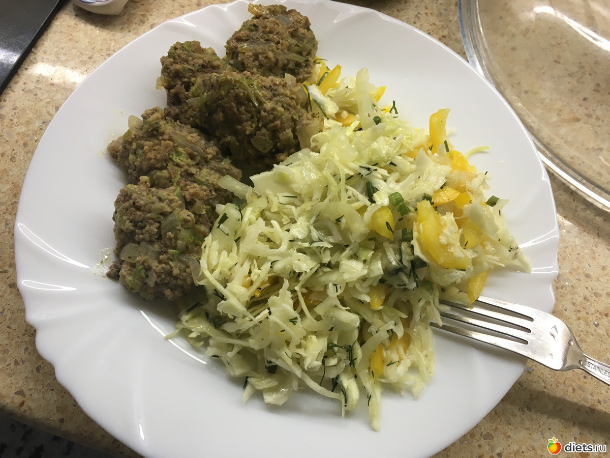 Обед. Салат из капусты и сладкого перца. Котлеты из говядины , кабачка и лука со специями, жаренные на сухой сковороде, альбом: Что бы такое съесть, чтобы похудеть?!