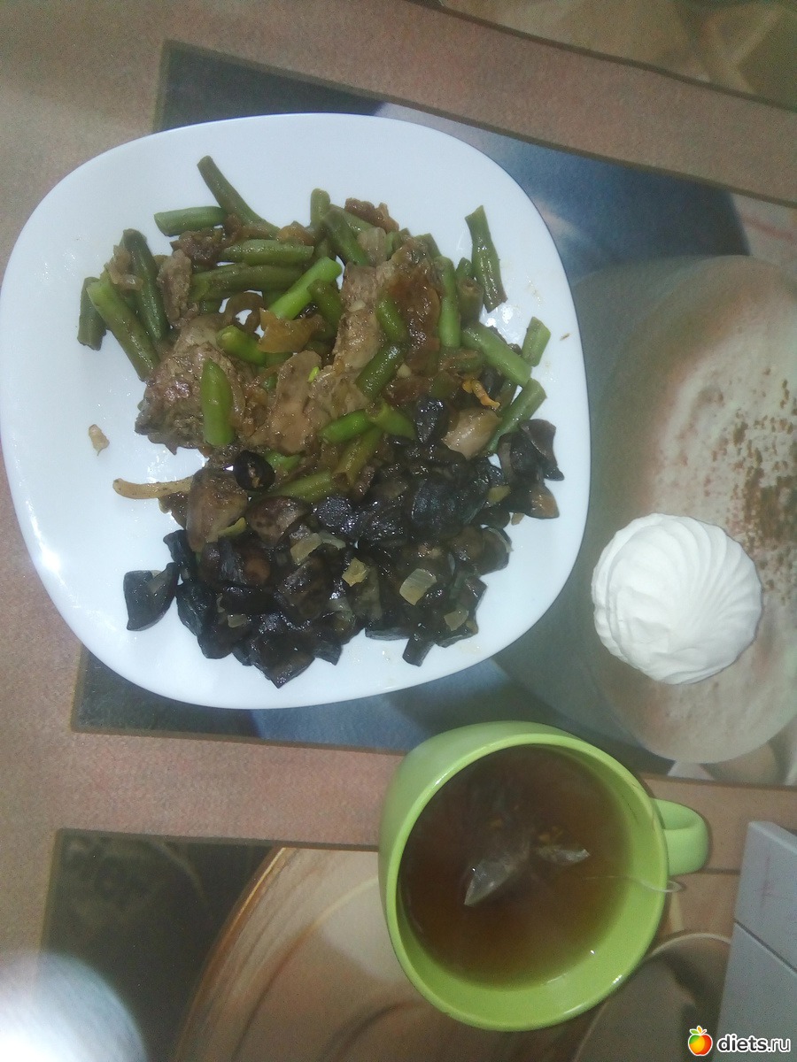 «05.02.18 завтрак: куриная печень тушенная со спаржей, чай б/с, зефирка)), грибы»