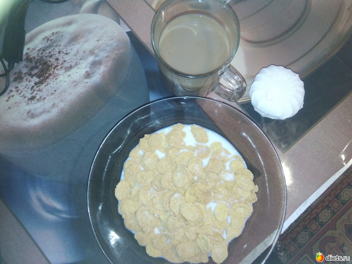 08.02.18 завтрак: хлопья Fitness с молоком, кофе с молоком, зефирка.