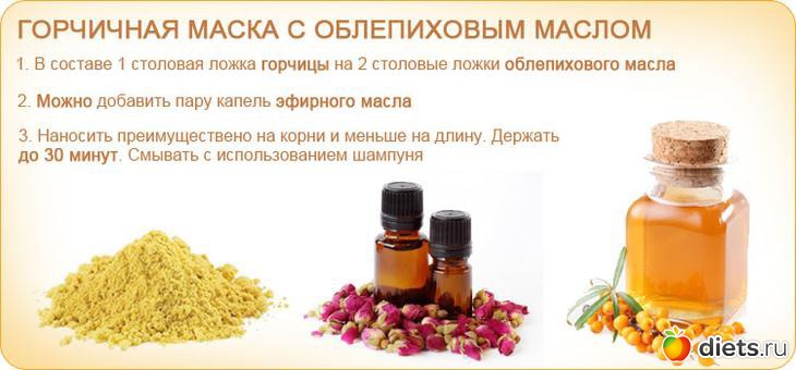 Большую ложку горчицы нужно размешать в облепиховом масле объемом 2 столовые ложки. Дополнительные любимые масла, как составляющие рецепта приветствуются в размере пары капель. Получаса вполне хватит, чтобы полезный состав обогатил локоны необходимыми компонентами. Его можно смывать водой с шампунем.