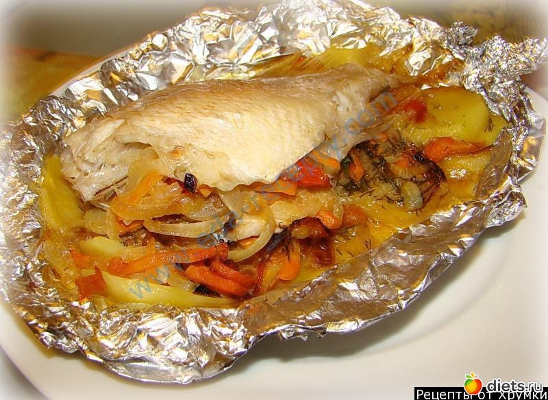 Морковку, лук и томаты режем соломкой и обжариваем. В конце жарки солим. Запекать окуня будем в фольге. Смазываем лист маслом, очищенный и порезанный кружочками картофель выкладываем на фольгу, чтобы кусочки немного перекрывали друг друга. На картофель – часть обжаренных овощей и мелко порезанную зелень, вторую часть отправляем внутрь рыбки. Нафаршированную рыбу выкладываем на овощи и заворачиваем все в фольгу. В разогретой духовке окунь должен провести около получаса.