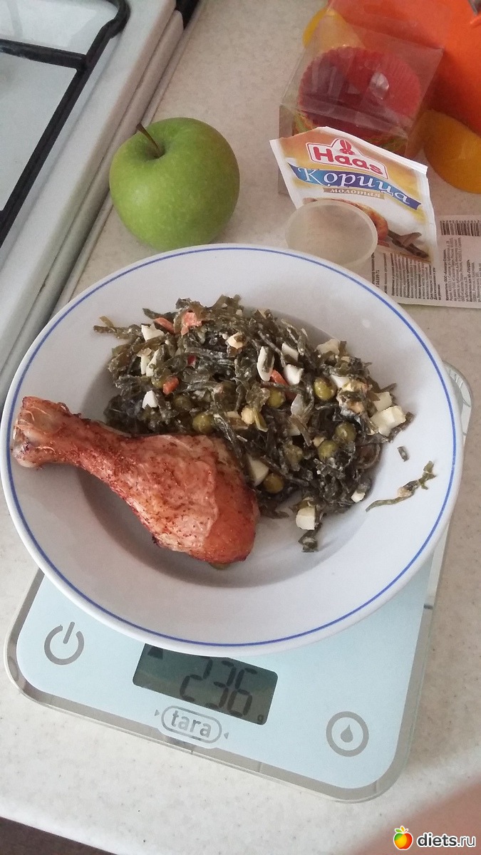 обед:кур.голень и салат из морской капусты,зел.горошка с яйцом, альбом: что кушаю