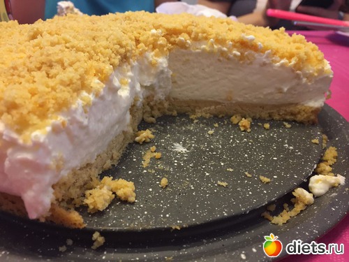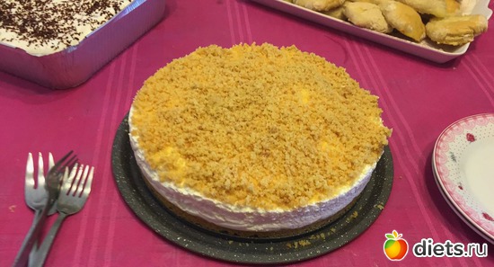 Оставшуюся часть испечёного теста перетереть в крошку - вилкой или руками и ещё пару минут подсушить в духовке, потом посыпать на верхнюю часть торта.
