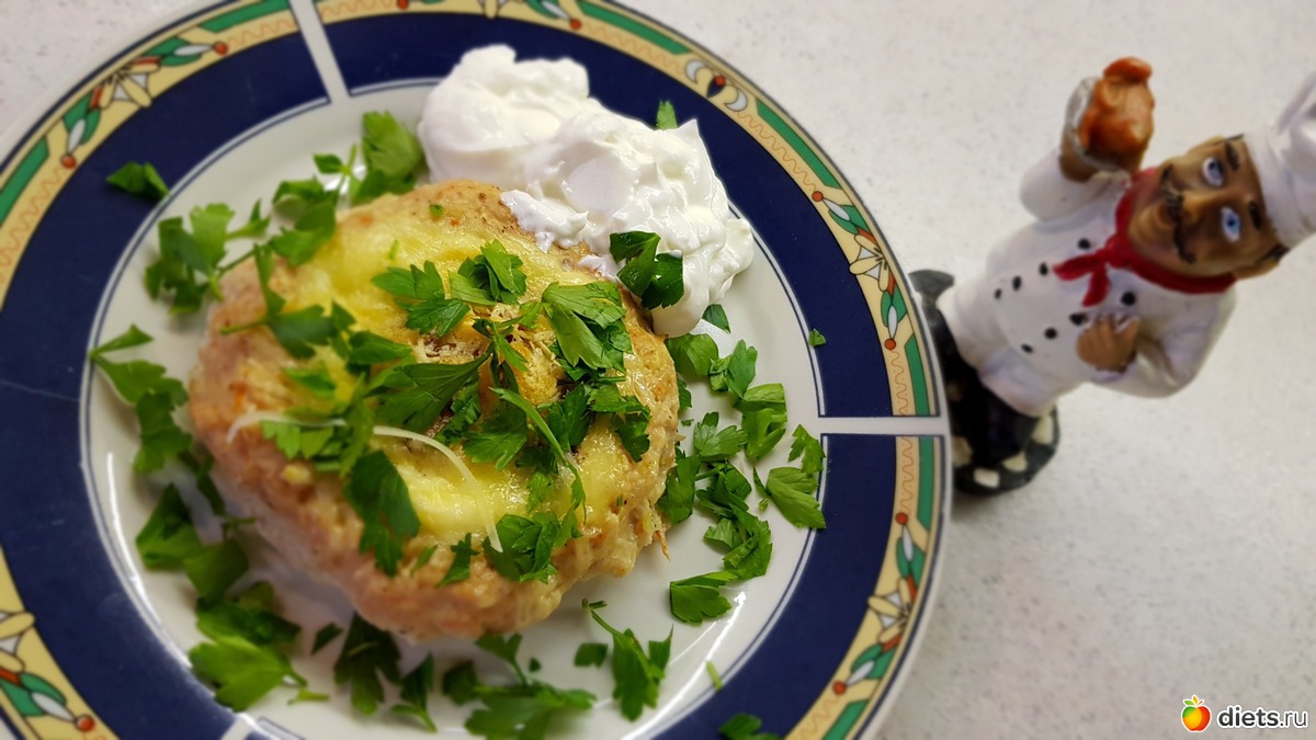 Всё смешать.Сформировать руками шарик большой посерединке сделать лунку,положить в форму для выпекания.