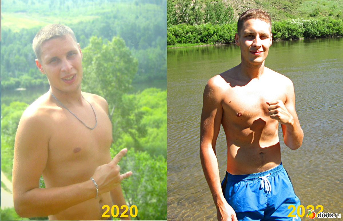 слева пухлик Чмоня весом под 90, спустя год -25% веса