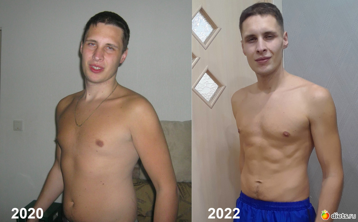 слева пухлик Чмоня весом под 90, спустя год -25% веса