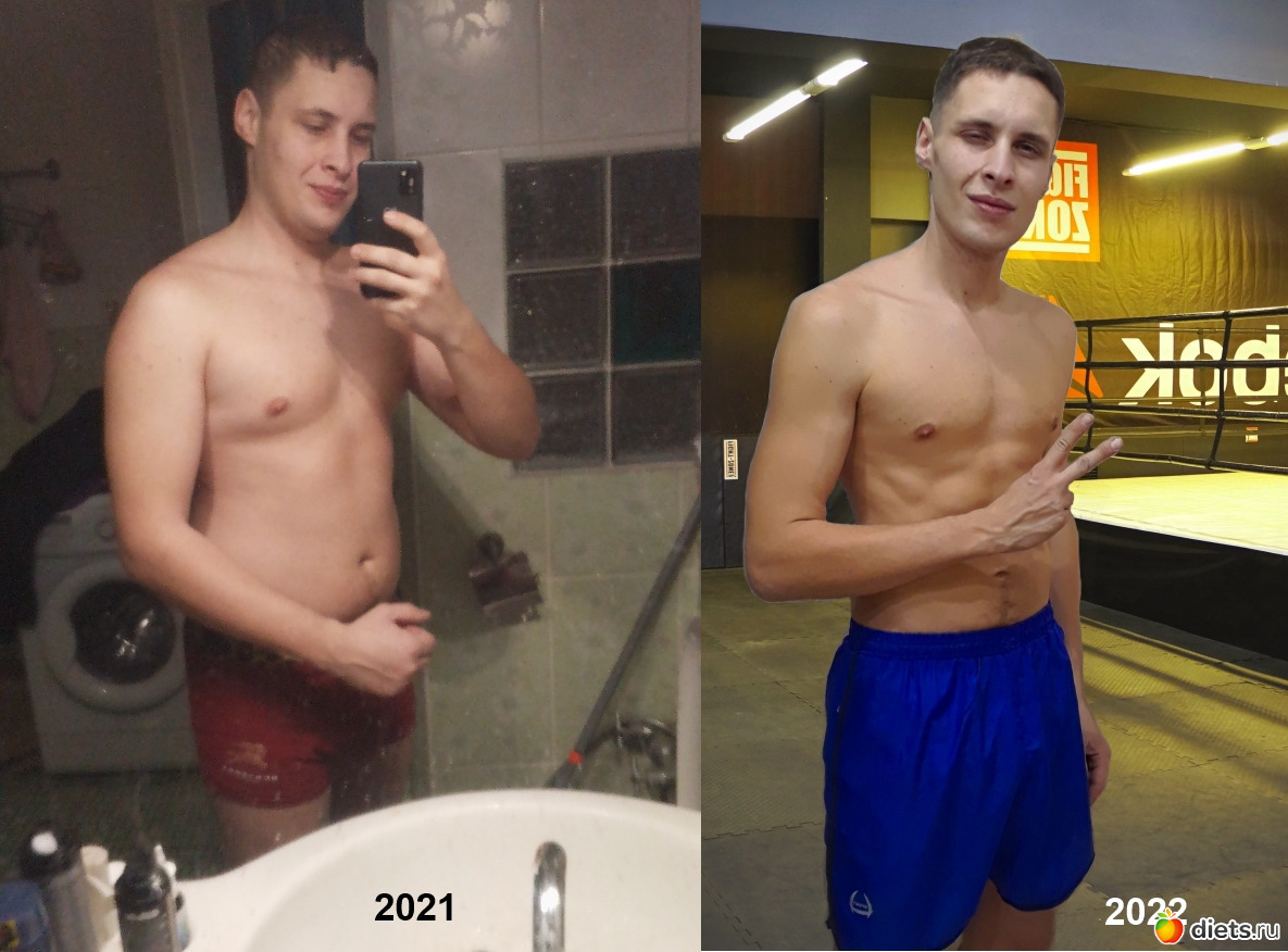 слева пухлик Чмоня весом под 90, спустя год -25% веса