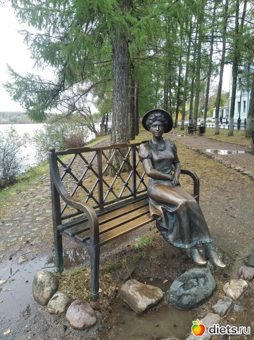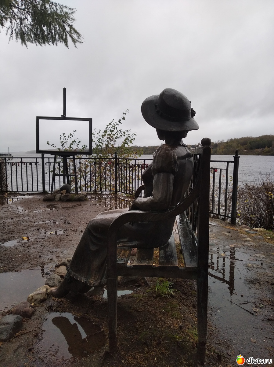 Здесь можно увидеть довольно необычный памятник. Дама, одетая по моде 19 века, в шляпке, сидит на скамье и смотрит на Волгу сквозь мольберт с установленной на нем картинной рамой.