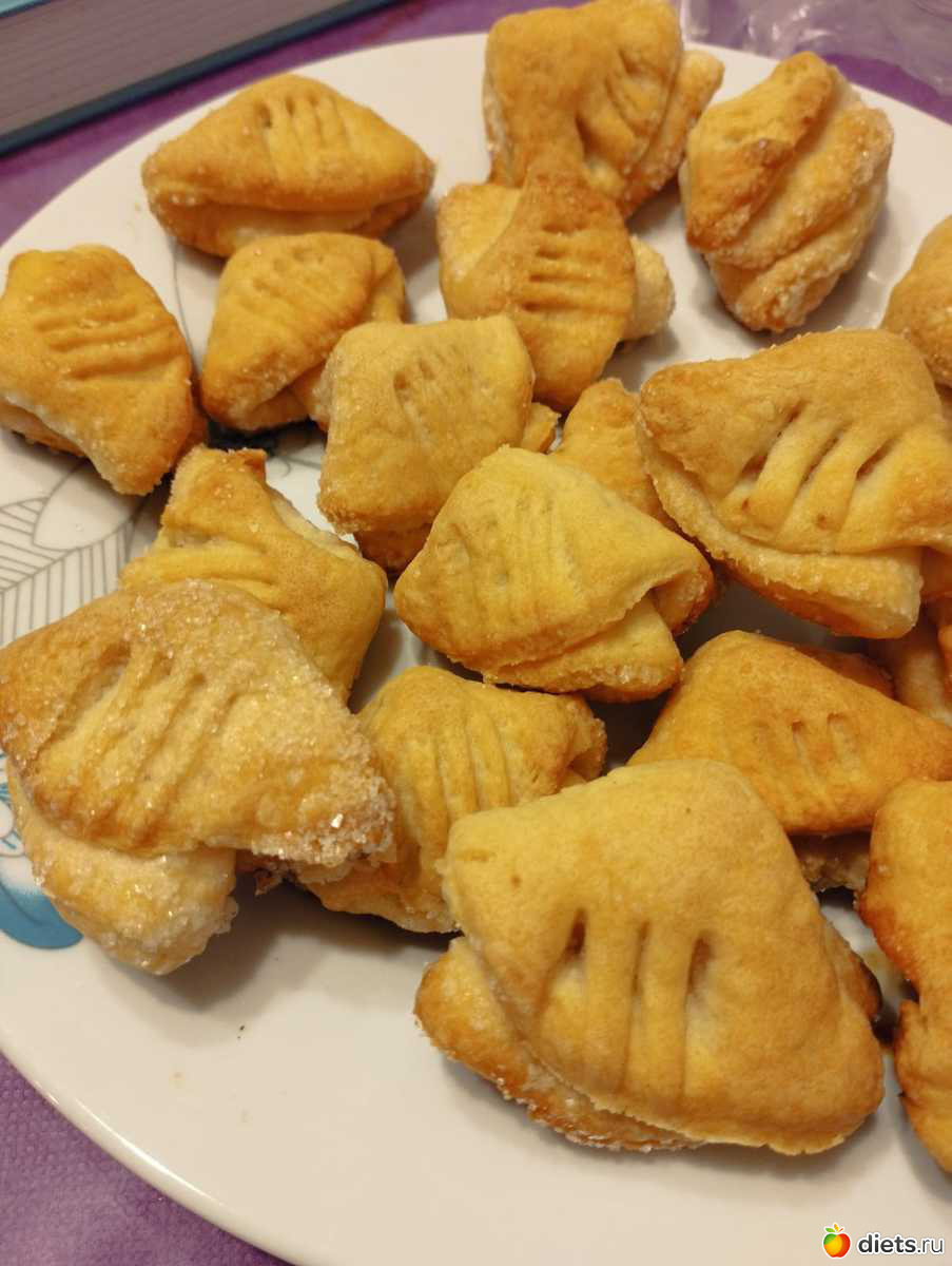 Обмакнуть в сахар, сложить пополам сахаром внутрь. Обмакнуть в сахар и сложить ещё раз сахаром внутрь. Выложить на противень и прижать