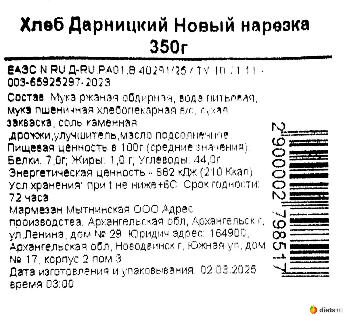 Хлеб Дарницкий Новый Пищевая ценность в 100г (средние значения). Белки. 7,0г; Жиры: 1,0 г; Углеводы: 44,0г Энергетическая ценность - 882 кДЖ (210 Ккал)
