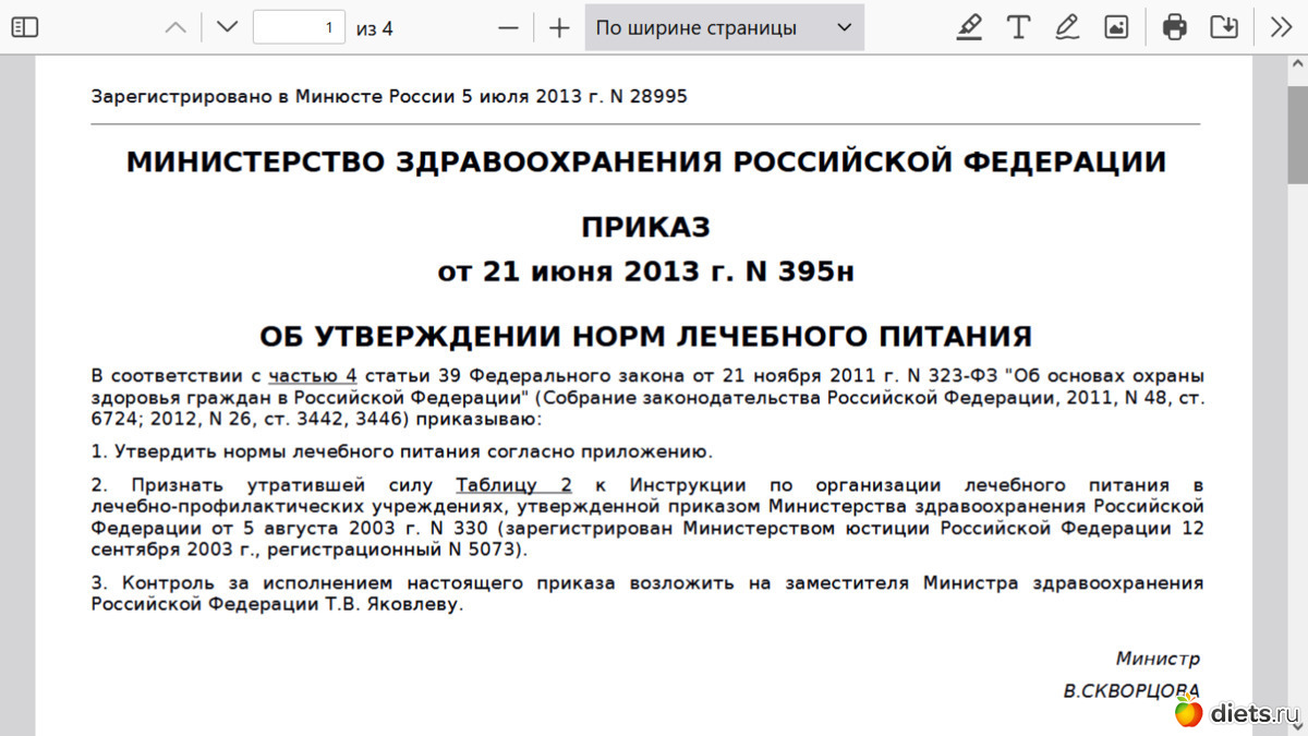 «МИНИСТЕРСТВО ЗДРАВООХРАНЕНИЯ РОССИЙСКОЙ ФЕДЕРАЦИИ ПРИКАЗ от 21 июня 2013 г. N 395н ОБ УТВЕРЖДЕНИИ НОРМ ЛЕЧЕБНОГО ПИТАНИЯ»