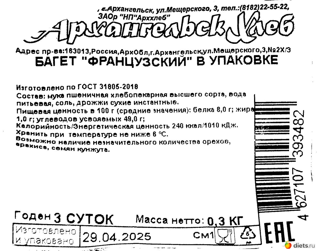 Состав: мука пшеничная хлебопекарная высшего сорта, вода питьевая, соль, дрожжи сухие инстантные.