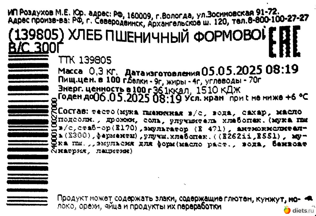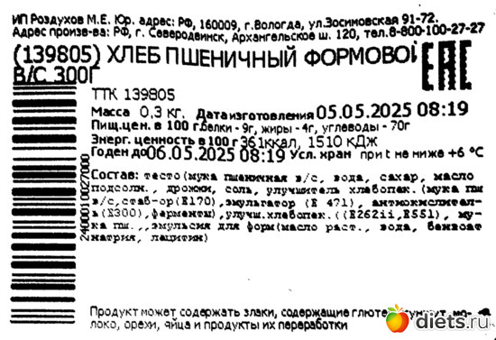 «ХЛЕБ ПШЕНИЧНЫЙ МАКСИ Пищ. цен. в 100 г.белки - 9г, жиры - 4г, углеводы - 70г Энерг. ценность в 100 г 361ккал»