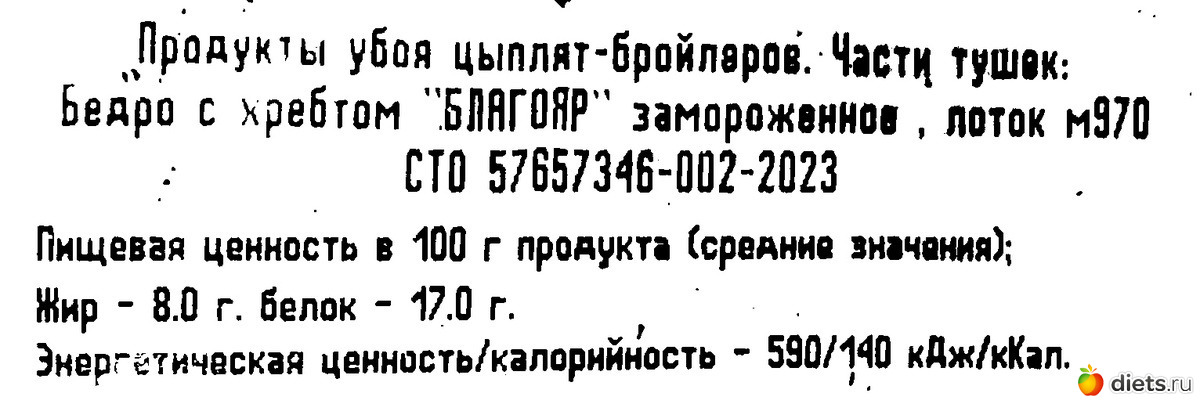 КУРИНАЯ ФЕРМА  Голень с кожей цыпленка-бройлера, в 100г. продукта: белки-не менее-18,0 г., жир-не более-14,0г., энергетическая ценность 198 Ккал