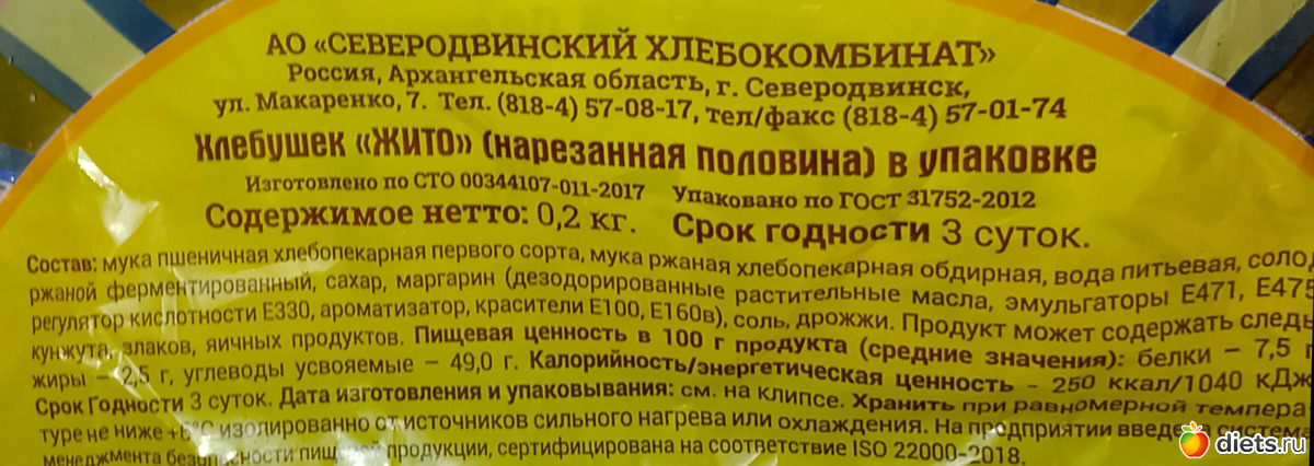 Состав: мука пшеничная хлебопекарная первого сорта, мука ржаная хлебопекарная обдирная, вода питьевая, солод ржаной ферментированный, сахар, маргарин (дезодорированные растительные масла, эмульгаторы E471, E475, регулятор кислотности E330, ароматизатор, красители E100, Е160в), соль, дрожжи. Продукт может содержать следы кунжута, злаков, яичных продуктов. Пищевая ценность в 100 г продукта (средние значения): белки - 7,5 г, жиры - 2,5 г, углеводы усвояемые - 49,0 г. Калорийность/энергетическая ценность - 250 ккал/1040 кДж