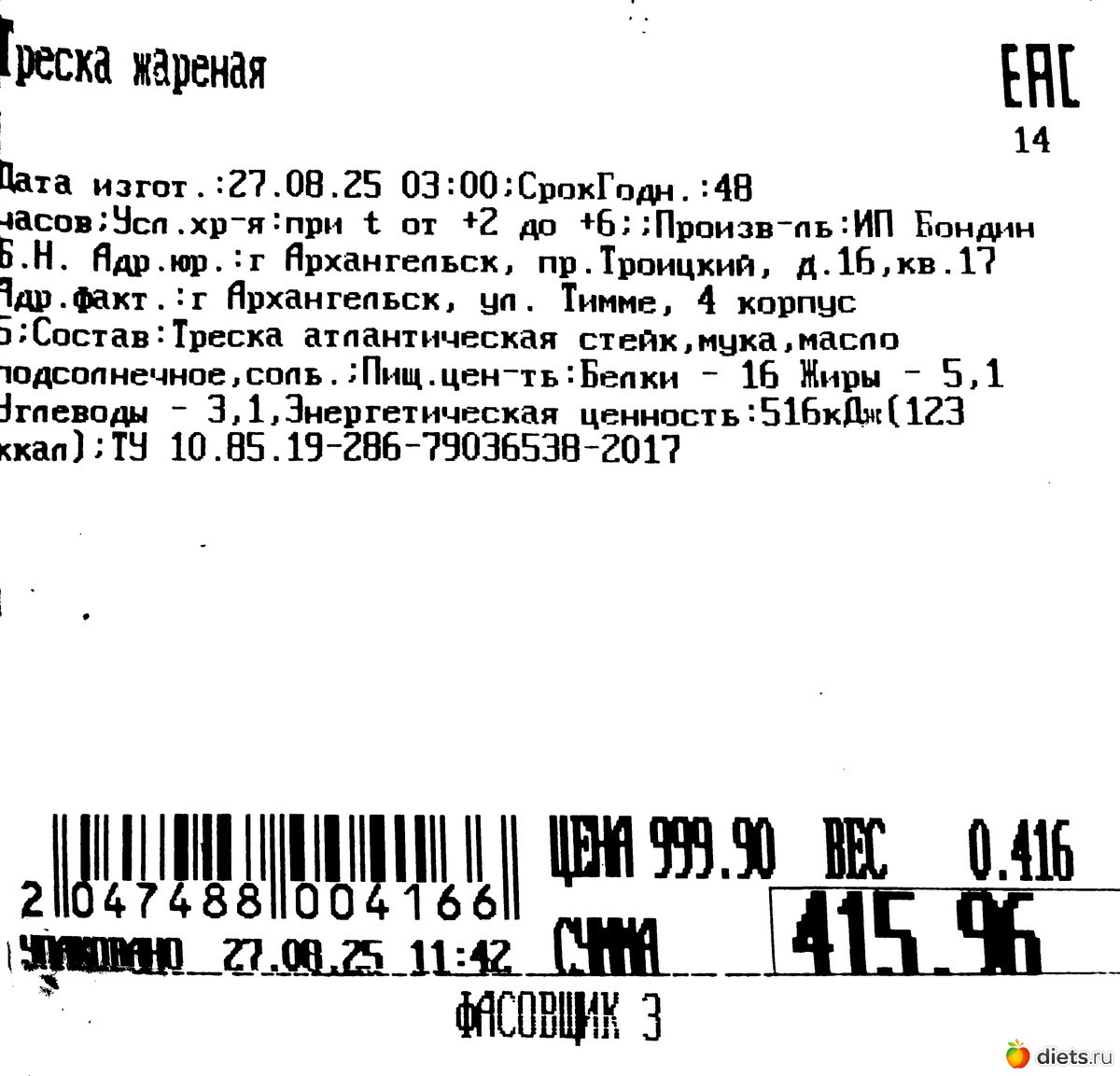 Состав: Треска атлантическая стейк, мука, масло подсолнечное, соль.: