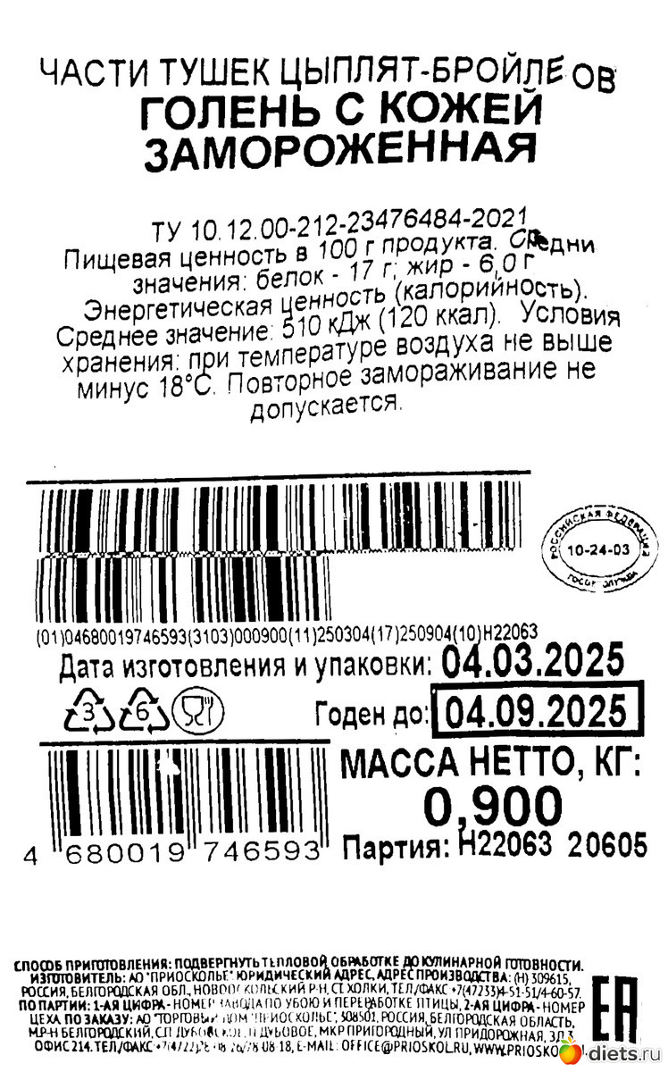 Энергетическая ценность (калорийность). Среднее значение: 510 кДж (120 ккал). Условия хранения: при температуре воздуха не выше минус 18°С. Повторное замораживание недопускается.