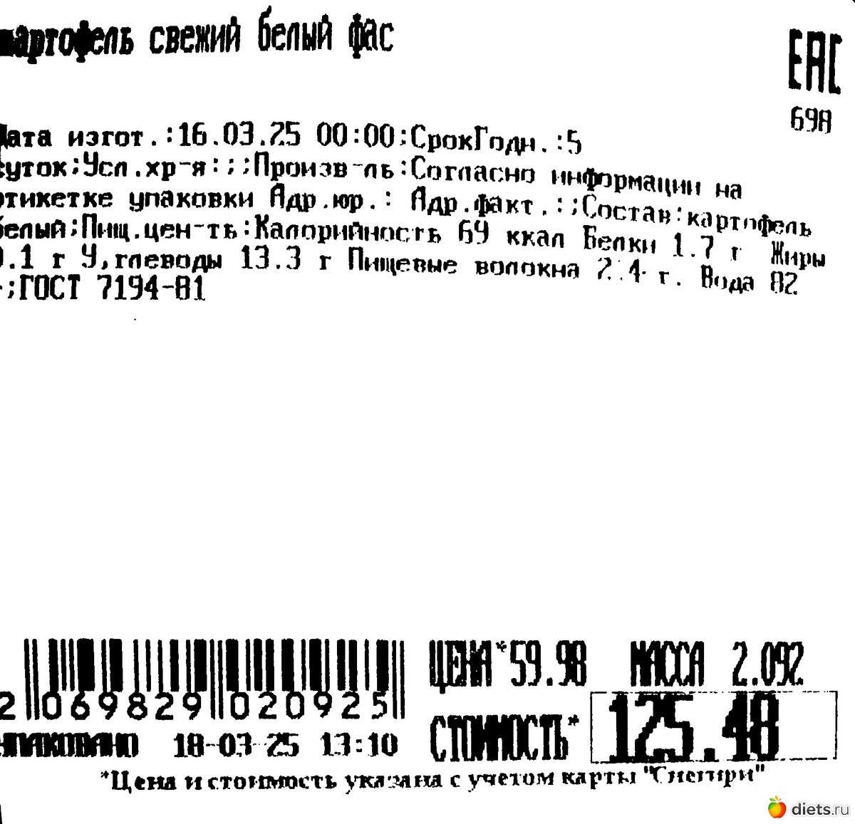 Пищевая ценность: Калорийность 69 ккал Белки 1.7 г Жиры 0,1 г углеводы 13.3 г Пищевые волокна ?.4 г. Вода 82 г. ГОСТ 7194-01