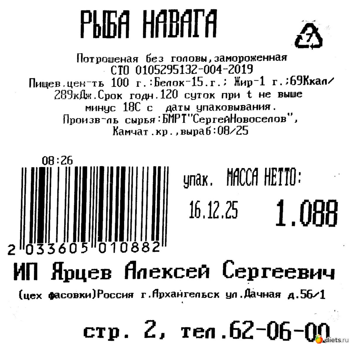 Пищевая ценность 100 г.:Белок-15.г.: Жир-1 г.: 69 Ккал/ 289кДж.Срок годн.120 суток при t не выше минус 18С с даты упаковывания. Произв-ль сырья: судно БМРТ "Сергей Новоселов", Камчатский край, выработан: 08/25 упакован 16.12.25 НЕтТО: 1.088 кг ИП Ярцев Алексей Сергеевич (цех фасовки) Россия г.Архангельск ул.Дачная д.56/1, стр. 2, теп. 62-06-00