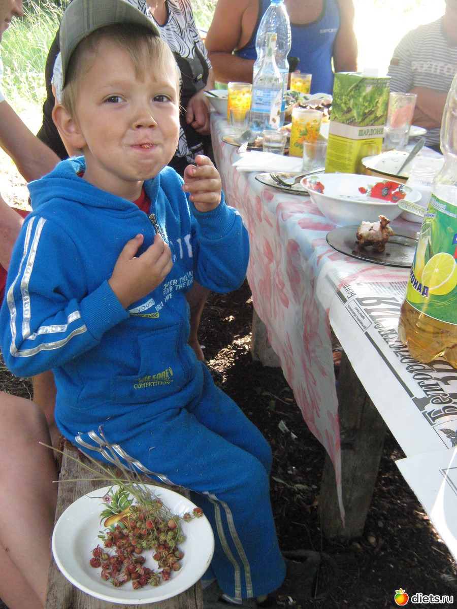 Земляничка была позже, а это он шашлык наяривает. Землянички он насобирал в тарелку, а рот набит шашлыком