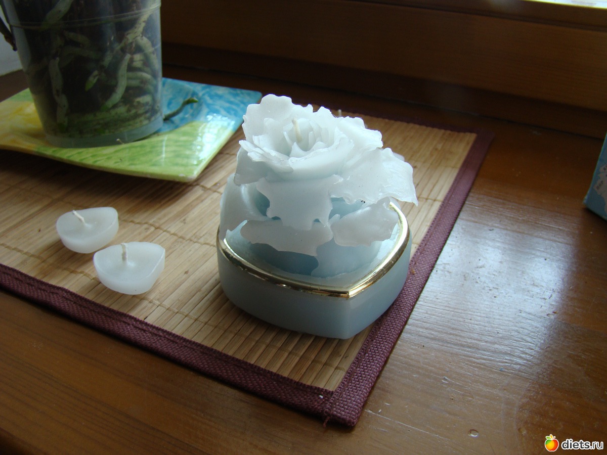 Основа - из-под музыкальной шкатулки. А лепестки - он выливал расплавленную свечку на форму из-под конфет ввиде листиков и ещё теплые сворачиывал и скреплял один к другому. Я спрошу у него подробнее