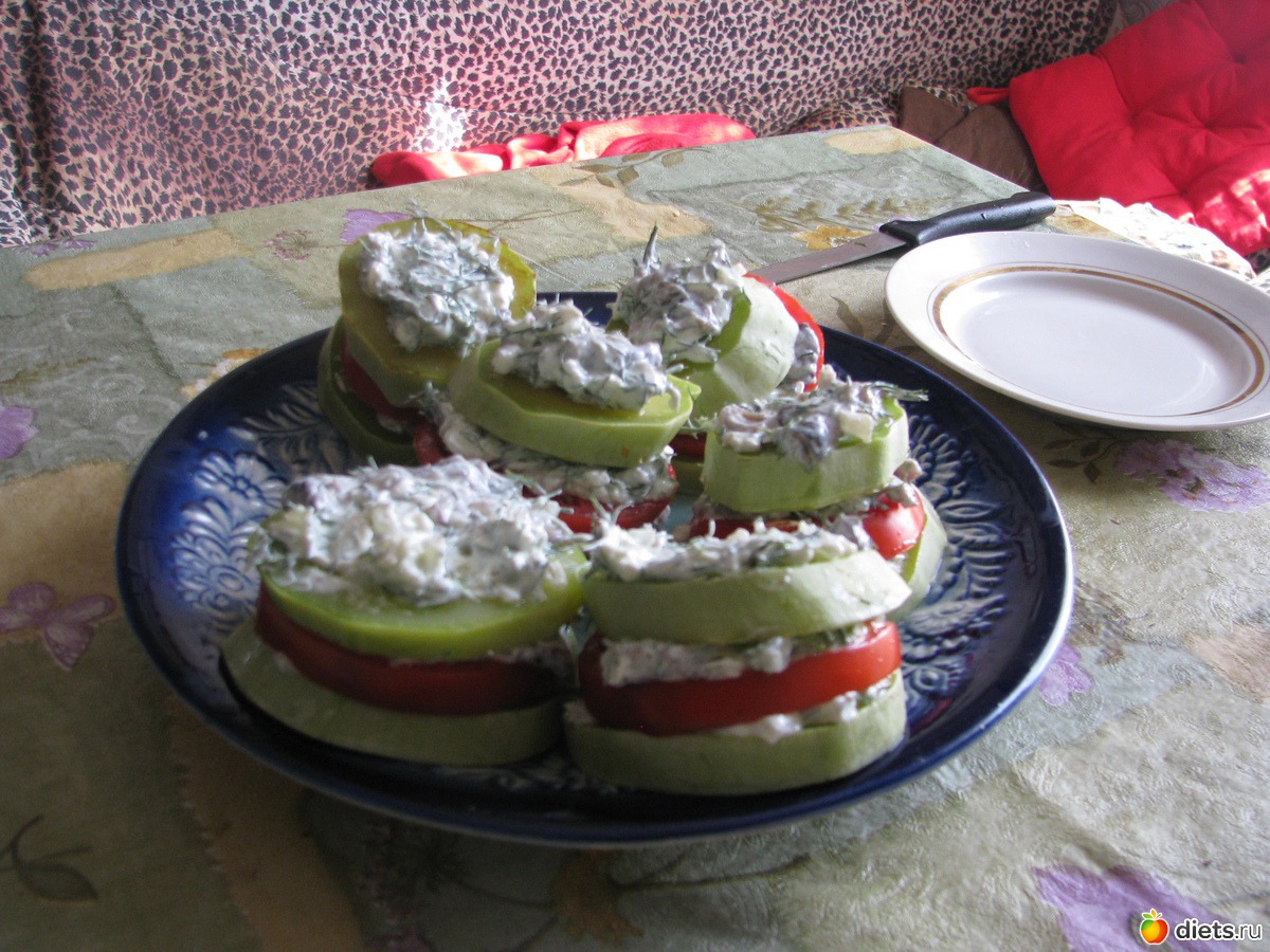 4. Выкладываем на тарелку слоями: кабачок - соус - помидор - соус - кабачок - соус.