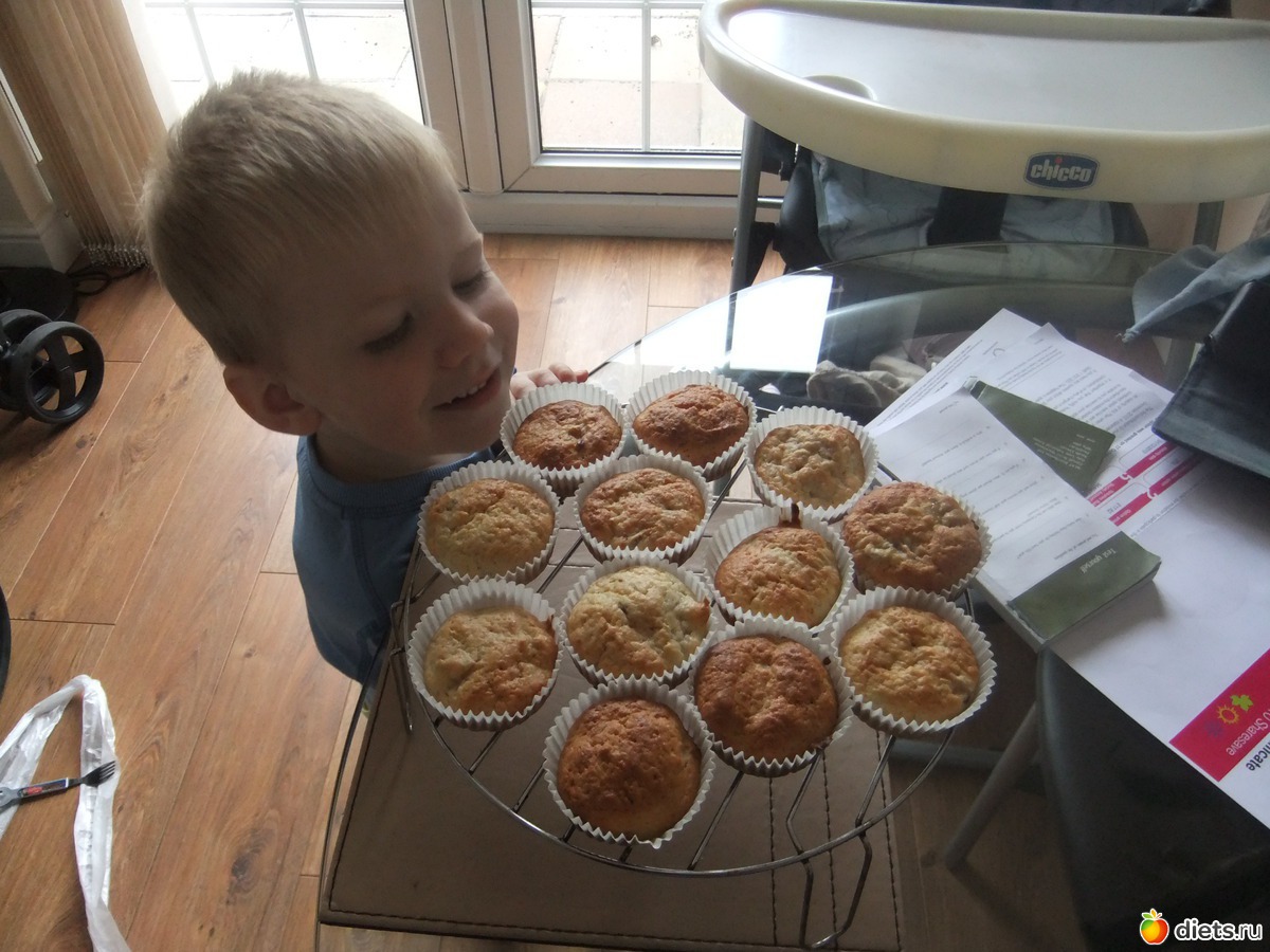 Мы делали маленькие маффины, получилось 18 штук, в одной штучке 133ккал. Если делать маффины человеческого размера, то у вас получится 12 штук, 198ккал.