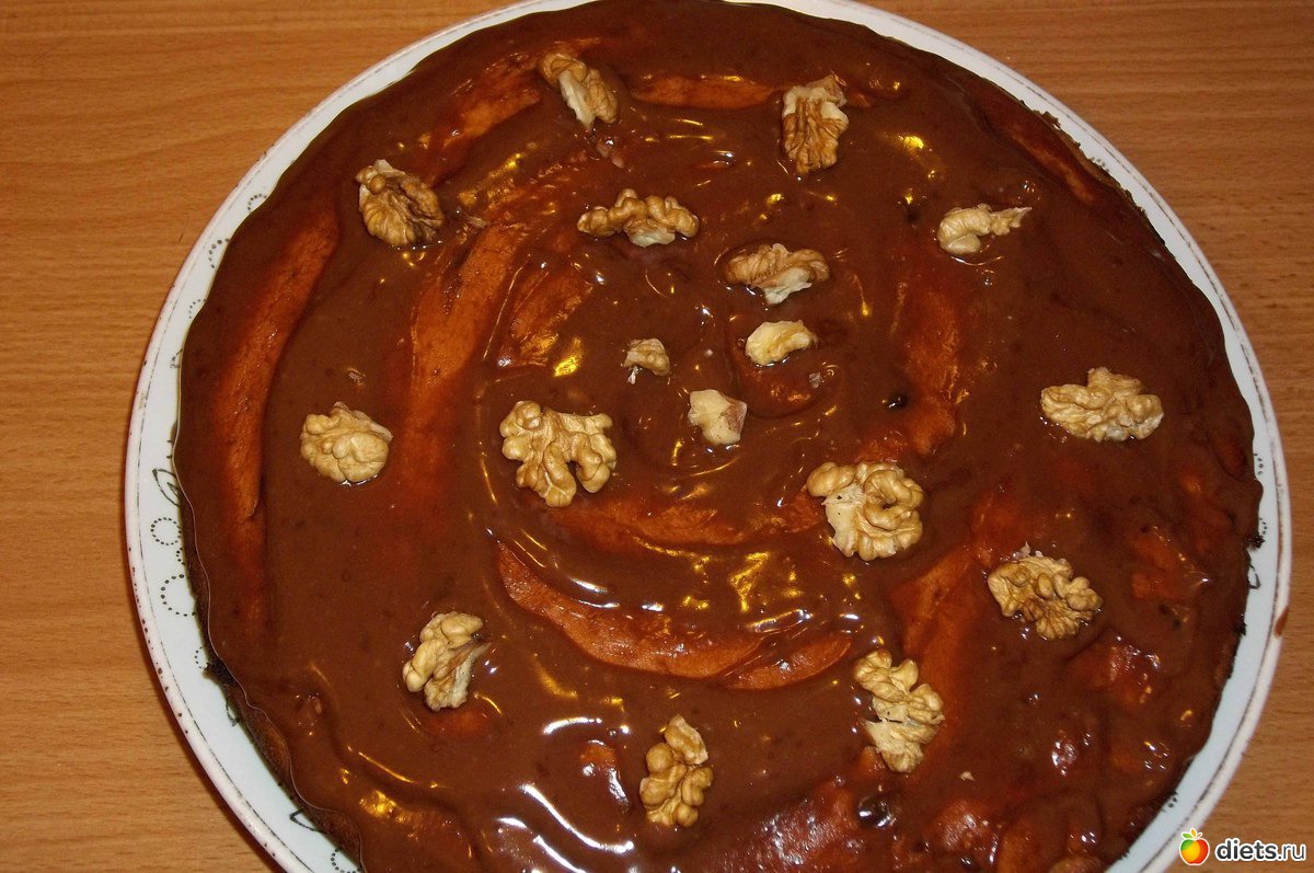 Масло растереть с сахаром, вбить яйца и небольшими порциями всыпать муку с разрыхлителем. Добавить измельченный шоколад (50 г) и орехи. Выпекать 40 минут при 180-200 градусах.