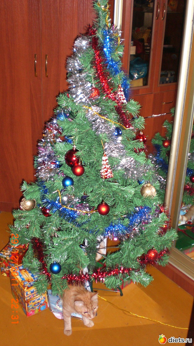 У нас есть похожее фото, только такой же хвостато-усатый стал разряжать елку еще до наступления НГ
