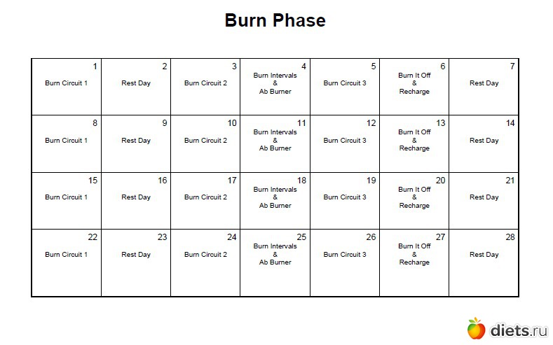 3 силовые(1,2,3 делаешь на одной неделе пн, ср, пт), 1 кардио+растяжка, 1 интервальная тренировка. Есть бонусные тренировки, которыми можно заменять кардио, йогу и растяжку. Силовые меняются каждый месяц(на всю программу их 9)