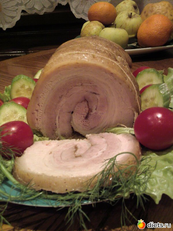 Для рулета взяла подчелок (так кажется), короче брюшко от свинки. Натерла специями для сала (купила на рынке), свернула рулет, обмотала в пакеты и сварила.