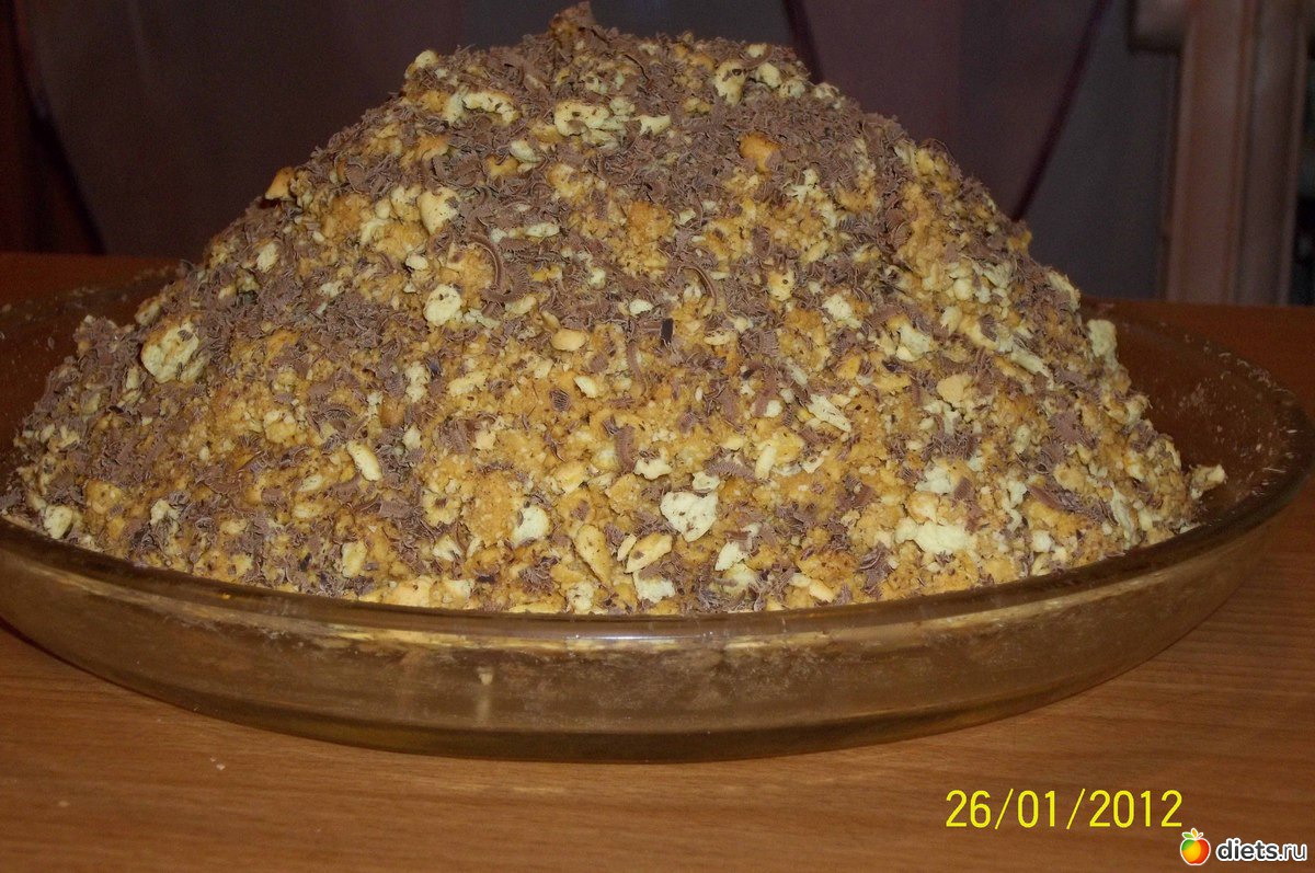 Соединить печенье с кремом и выложить все на плоское блюдо горкой. Сверху посыпать тертым шоколадом