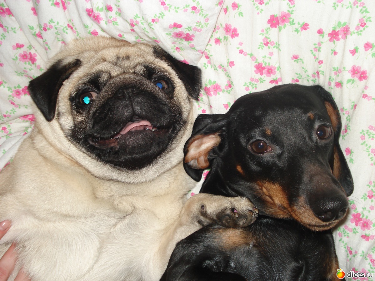 Я много лет удивляюсь на их дружбу. Такса была уже взрослая, когда появился мопсенок. Целую ночь рычала, под утро стала тыкать её носом. А та пухленькая, качается от тычков и только глазищами хлопает, так грустно. Такса взбодрилась, решила что она ей не угроза и ...удочерила.