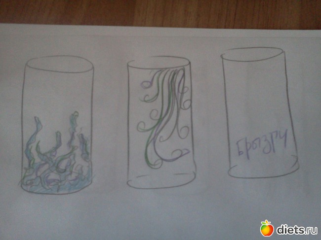 Слева- струи воды, пример я выложила чуть ниже отдельным фото, посередине типа усиков огурца, изящно струющихся сверху вниз, правая- прорисовывать не стала, т.к. там идя брызг и каплей краски, пример выложила отдельной картинкой