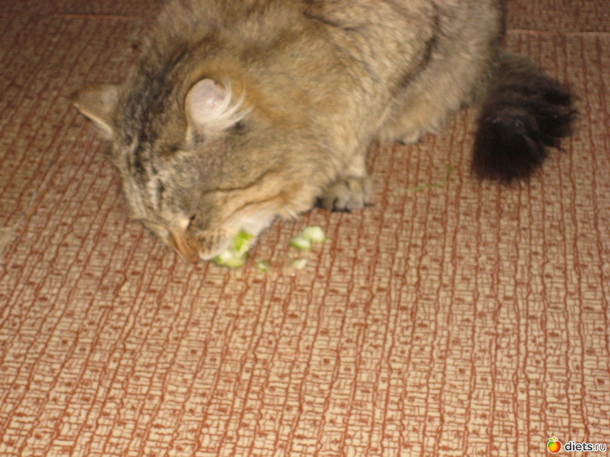 Ест сырые огурцы.И дерется за них как за мясо!
