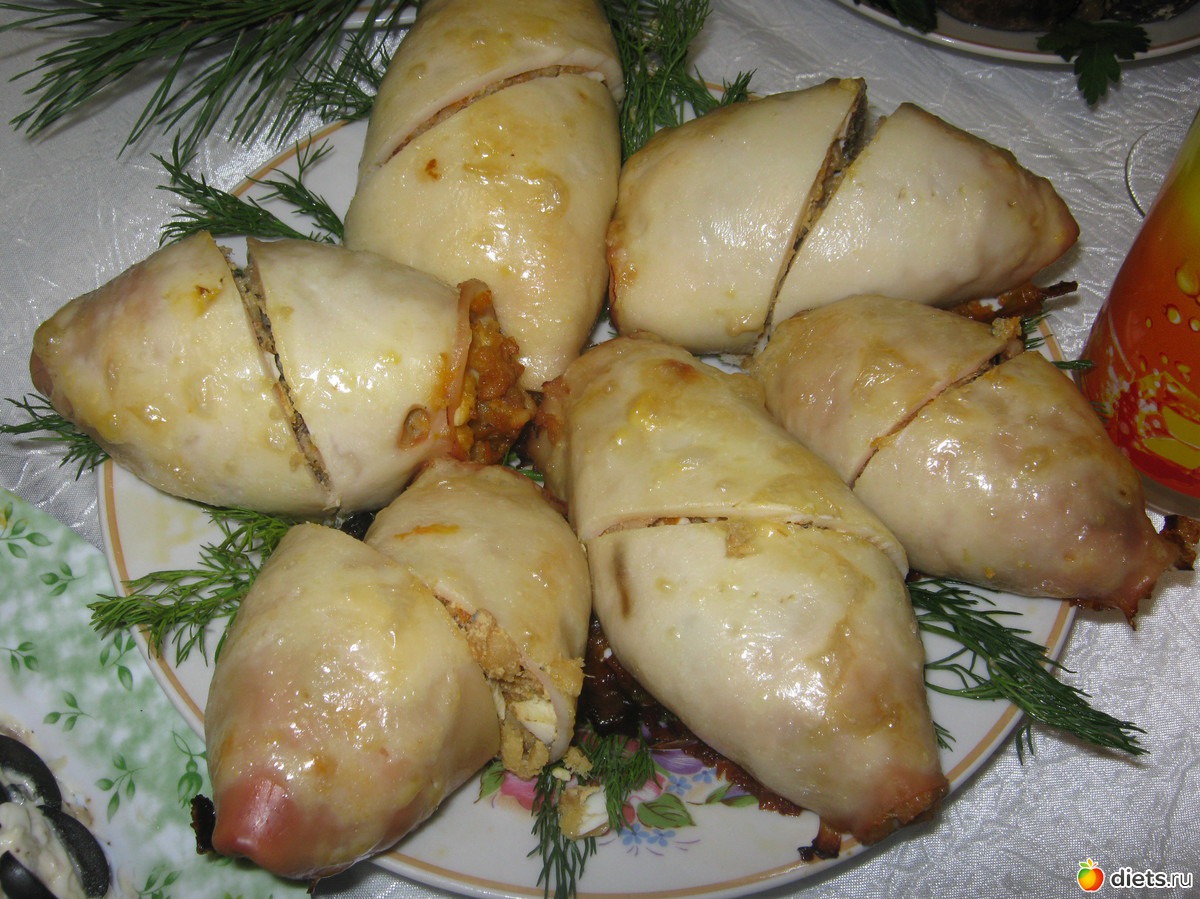 5. Обрезать у кальмаров хвостики, мелко порезать и добавить к рыбной массе. И этой массой начинить тушки кальмаров.