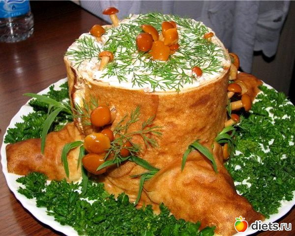 Оформляем "пенёк" грибами и зеленью, как показано на фото.