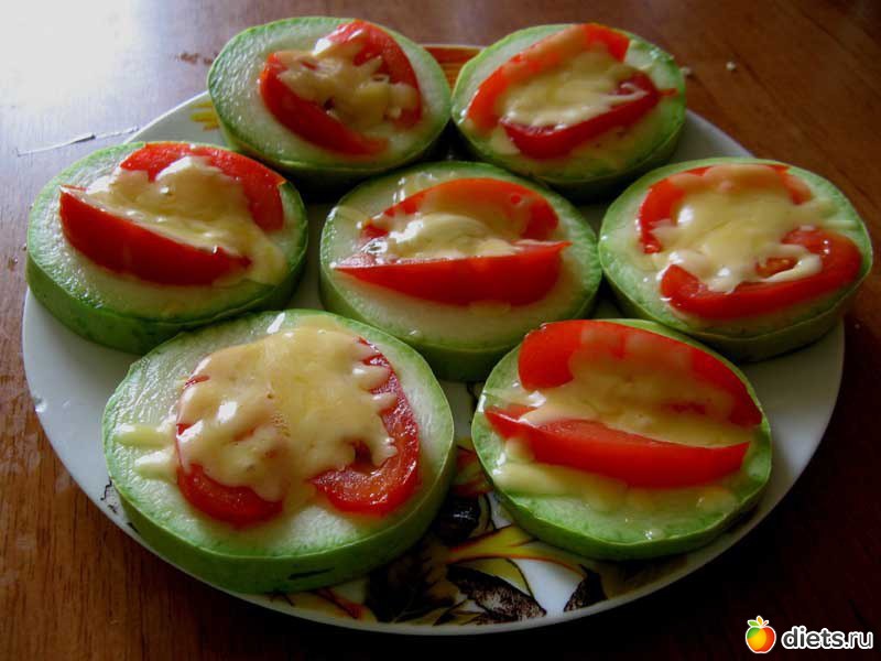 Сверху на кабачки положить ломтики помидоров