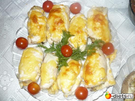 Куриные грудки режем так чтобы из одной грудки получилось 4 кусочка ; отбиваем солим, перчим смазваем немного майонезом; выкладываем на кусочек начинку; заворачиваем рулетик; смызаваем сверху майонезом; посыпаем сыром (тертым на крупной терке) и отправляем в духовку разогретую до 200 градусов на 30-35 мин. До золотистого цвета запекаем!