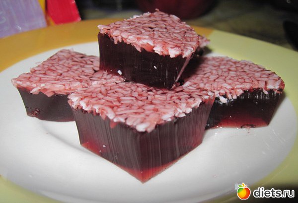 3. В формочки залить нектар с желатином, сверху посыпать кокосовой стружкой (можно и орешками колотыми), и поставить застывать в холодильник.