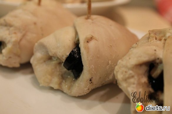 Нарезаем маслины кольцами.Шампиньоны маленькими квадратиками.На филе выкладываем нарезанные маслины.Затем шампиньоны и закручиваем куриное филе в рулетики.Соединяем зубочисткой.Выкладываем в пароварку.Готовим 30 минут.