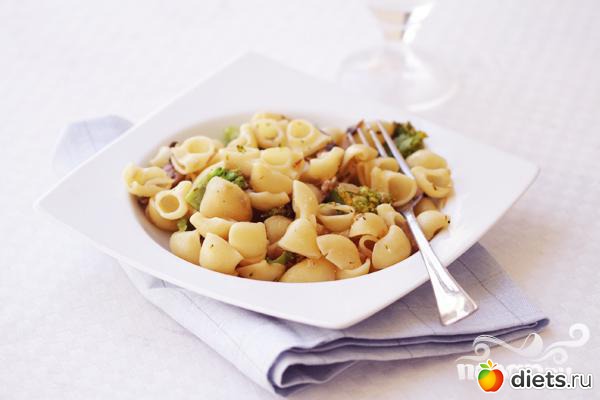 Отварить макароны в подсоленной кипящей воде. Покрошить лук, раздавить чеснок, нарезать грибы ломтиками, брокколи порезать на мелкие цветочки.
