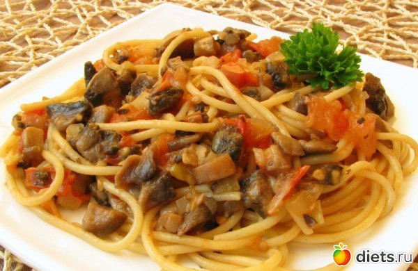 6. Выкладываем спагетти на тарелку и перемешиваем с овощами. Сверху посыпаем мелко нашинкованной зеленью.