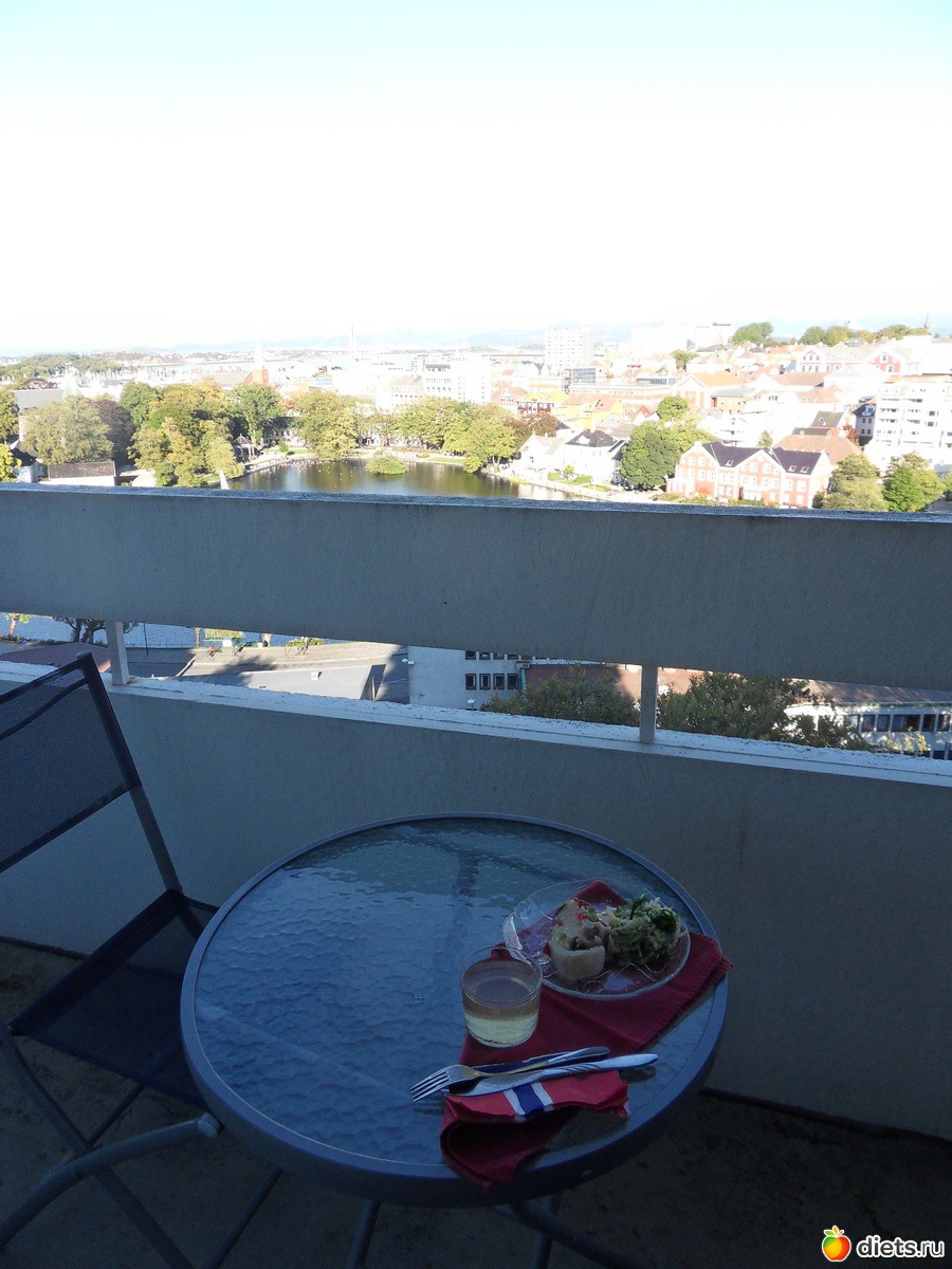 Можно поесть на терассе  в солнечный день, салат из зеленого яблока и сельдерея с треской. Напиток  из имбиря и лимона., альбом: Прогулка по Ставангеру, очень солнечный день !!