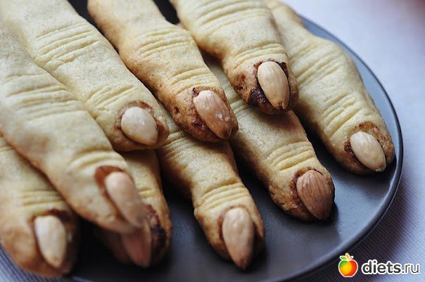 Доставать по небольшому кусочку теста, рукой на столе скатать в "колбасу". Это - основа для пальца. Придать форму пальца. Шоколад растопить, добавить немного воды и смазать место для ногтя и конец пальца. На каждый палец положить миндаль и придавить.